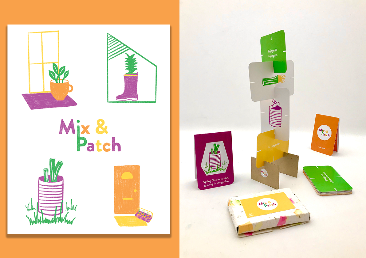 Mix and Patch is a children's card game focused around growing your own fruit and vegetables. I designed the game for any child living in either a city or the countryside could grow some form of food. Using found objects around the house, this game would encourage them to reuse, recycle and repurpose scraps of food and their packaging. For example, you could regrow new carrots from the carrot tops and you could do this in a used plastic container all outside of your front door. The game is focused around the child collecting the correct cards to make their food grow, and understanding what happens at each stage. Mix and Patch encourages a small nudge that could make a big difference within households. Getting children interested in growing fruit and vegetables could see the new generation being far more self-sufficient than we are, is simply a step in the right direction towards a healthier and more sustainable planet.